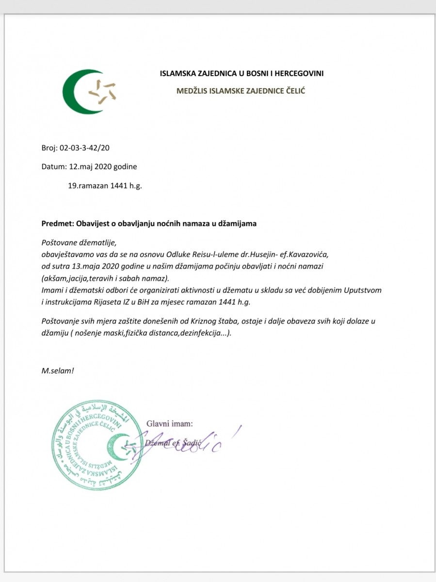 obavještavamo Vas da se na osnovu Odluke reisu-l-uleme dr. Huseina-ef. Kavazovića od sutra, 13. maja 2020. godine, u centralnim džamijama svih naših džemata počinju obavljati i noćni namazi (akšam, jacija, teravih i sabah-namaz).